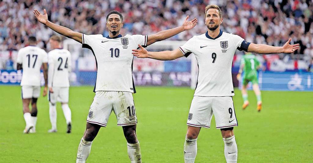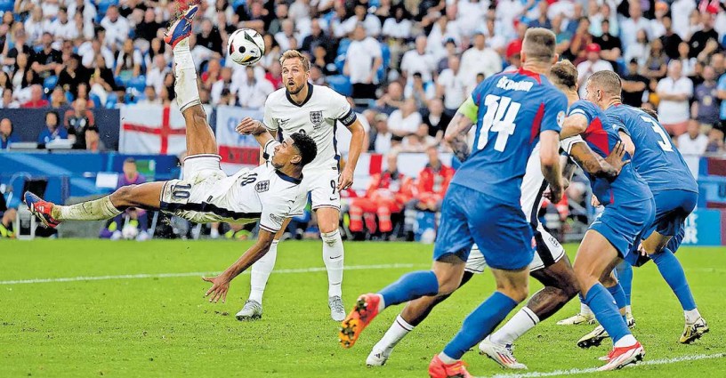 സ്ലൊവാക്യയ്ക്കെതിരെ ഇംഗ്ലണ്ട് താരം ജൂഡ് ബെലിങ്ങാം ഓവർഹെഡ് കിക്കിലൂടെ ഗോൾ നേടുന്നു.