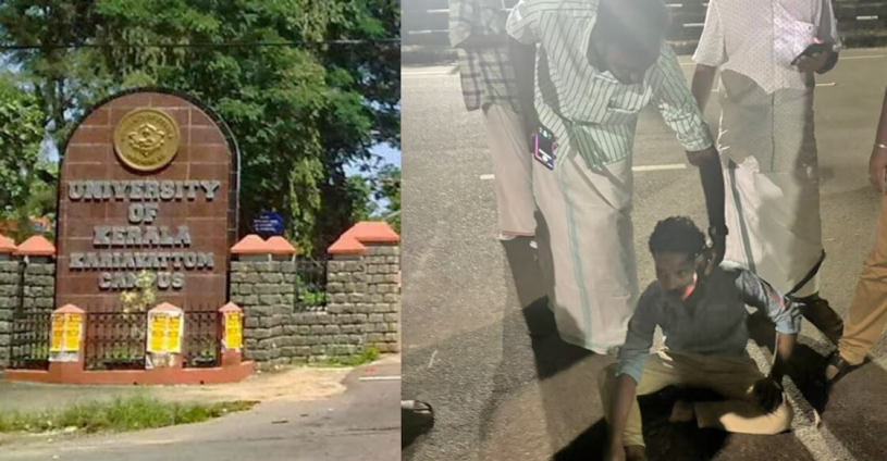 കേരള സർവകലാശാല ക്യാംപസ്, മർദനത്തിന് ഇരയായ സാഞ്ചോസ് നിലത്തിരിക്കുന്നു (Photo: Special Arrangement)