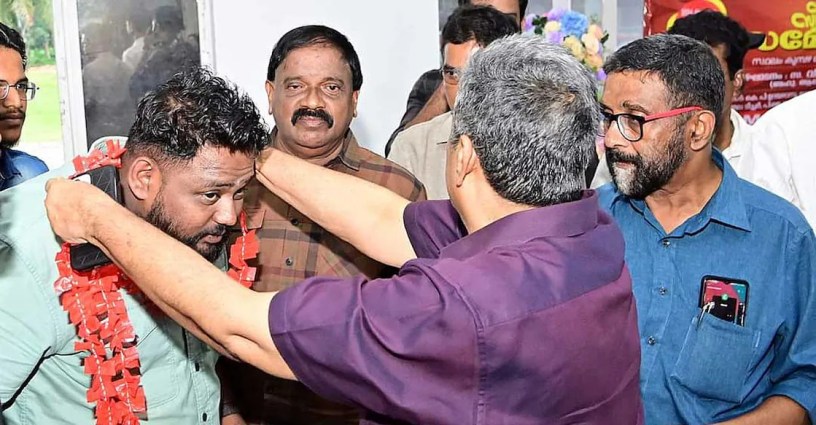 ശരൺ ചന്ദ്രനെ സിപിഎം പത്തനംതിട്ട ജില്ലാ സെക്രട്ടറി കെ.പി. ഉദയഭാനു മാലയിട്ട് സ്വീകരിക്കുന്നു