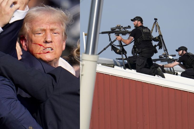 1.വെടിയേറ്റ ഡൊണാൾഡ് ട്രംപ്, 2. അക്രമിക്കെതിരെ പ്രത്യാക്രമണം നടത്തുന്ന സ്നൈപ്പർമാർ | Photos: Associated Press