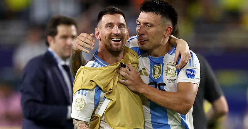 കോപ്പ അമേരിക്ക ഫൈനലിൽ കൊളംബിയയ്ക്കെതിരെ അർജന്റീന ഗോൾ നേടിയത് ലിസാൻഡ്രോ മാർട്ടിനസും ലയണൽ മെസ്സിയും ചേർന്ന് ആഘോഷിക്കുന്നു. ചിത്രം: REUTERS/Agustin Marcarian