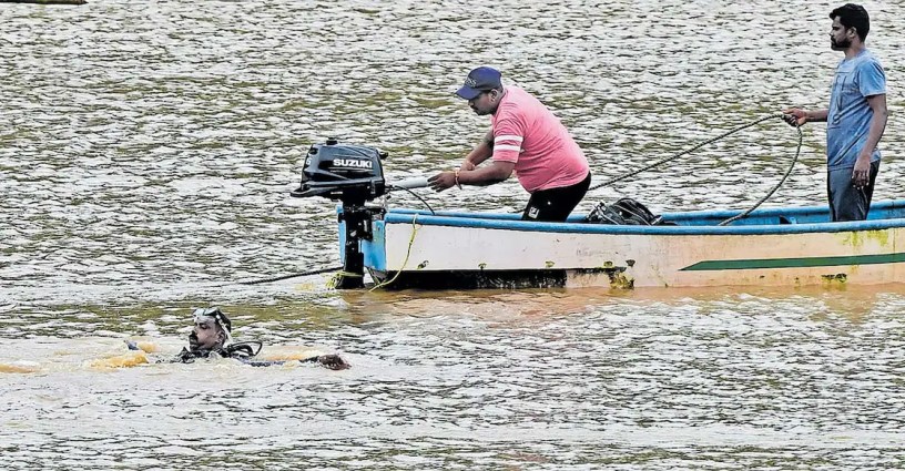 ഷിരൂരിൽ മണ്ണിടിച്ചിലിനെത്തുടർന്നു കാണാതായ അർജുനു വേണ്ടി ഗംഗാവലിപ്പുഴയിലിറങ്ങി പരിശോധന നടത്തുന്ന പ്രാദേശിക മത്സ്യത്തൊഴിലാളി ഈശ്വർ മൽപേയും സംഘവും. 8 തവണ സംഘം നടത്തിയ ശ്രമത്തിനിടെ ഒരു തവണ വടം പൊട്ടി ഈശ്വർ മൽപേ 100 മീറ്ററോളം ഒഴുക്കിപ്പോയി. നാവികസേനാസംഘമാണ് ഈശ്വറിനെ രക്ഷിച്ചത്.