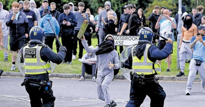 ഇംഗ്ലണ്ടിലെ സൗത്ത് യോർക്ഷറിൽ കുടിയേറ്റവിരുദ്ധ പ്രക്ഷോഭകാരി പൊലീസിന് നേർക്ക് തടിക്കഷ്ണം വലിച്ചെറിയുന്നു. ചിത്രം: എപി