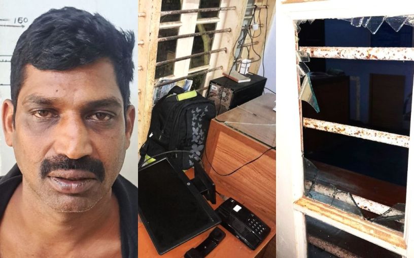 അറസ്റ്റിലായ അജികുമാർ, ഓഫീസിലെ ഉപകരണങ്ങൾ തകർത്ത നിലയിൽ, ജനാലകൾ അടിച്ചുതകർത്ത നിലയിൽ | Photo: Special Arrangement
