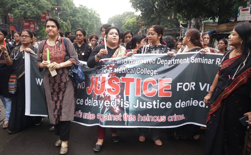 വനിതാ ഡോക്ടറുടെ കൊലപാതകത്തില് പ്രതിഷേധിച്ച് കൊല്ക്കത്തയില് ഡോക്ടര്മാര് നടത്തിയ മാര്ച്ച് | Photo: ANI