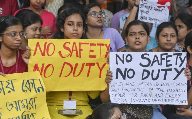 വനിതാ ഡോക്ടറുടെ കൊലപാതകത്തിൽ പ്രതിഷേധിച്ച് കൊൽക്കത്തയിൽ സമരംചെയ്യുന്ന ഡോക്ടർമാരും മെഡിക്കൽ വിദ്യാർഥികളും | ഫോട്ടോ: പി.ടി.ഐ