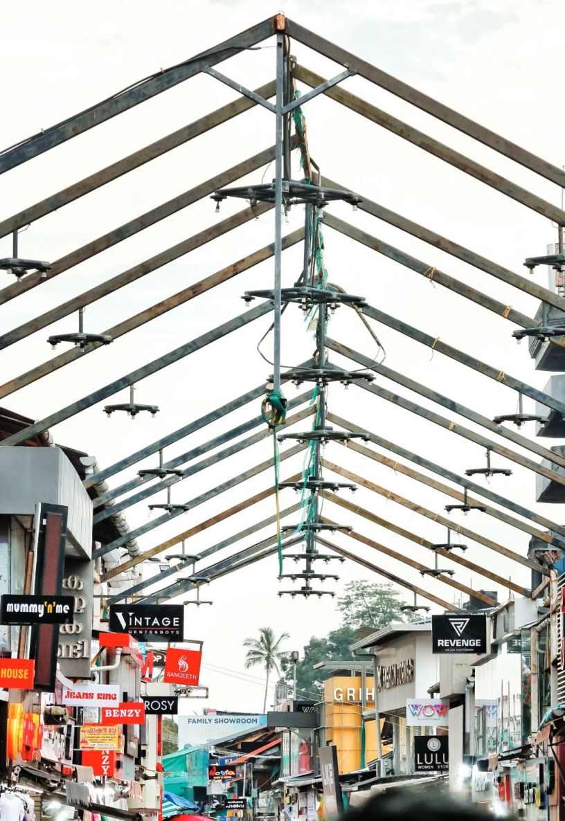 മിഠായിത്തെരുവിന്റെ മേലാപ്പിലെ ഉണ്ടവിളക്കുകൾ അഴിച്ചുമാറ്റിയ നിലയിൽ