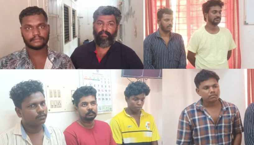 ചെങ്കൽ അലത്തറവിളാളം എസ്.എസ് ഭവനിൽ സാജൻ.എസ്.പി(37), അലത്തറവിളാകം വീട്ടിൽ കിട്ടു എന്ന് അറിയപ്പെടുന്ന റോഷിൻ സാംരാജ്(23), അലത്തറവിളാകം വീട്ടിൽ സച്ചു എന്ന് അറിയപ്പെടുന്ന പ്രിയേഷ്(29), അലത്തറവിളാകം വീട്ടിൽ ജോയ്കുട്ടി (34), ആറയ്യൂർ അലത്തറവിളാകം പുത്തൻവീട്ടിൽ ജിജോ(28), ആറയ്യൂർ അലത്തറവിളാകം സുധീഷ് ഭവനിൽ സുധീഷ് (29), ആറയ്യൂർ അലത്തറവിളാകം വി.എസ്.ഭവനിൽ വിനോദ് (40), ആറയ്യൂർ അലത്തറവിളാകം വീട്ടിൽ അഖിൽ(29) എന്നിവരാണ് പിടിയിലായത്.