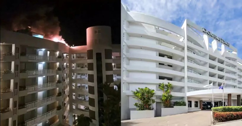 അപകടം ഉണ്ടായ ഹിൽട്ടൺ ഹോട്ടൽ. 1. Image Credit: X/Carlos Salas. 2. Image Credit: hilton
