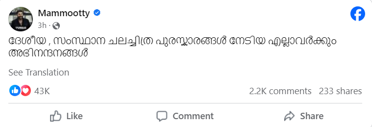ദേശീയ, സംസ്ഥാന ചലച്ചിത്ര പുരസ്കാരങ്ങൾ നേടിയ എല്ലാവർക്കും അഭിനന്ദനങ്ങൾ എന്നാണ് മമ്മൂട്ടി സോഷ്യൽ മീഡിയയിൽ കുറിച്ചത്. പുരസ്കാര പ്രഖ്യാപനങ്ങൾക്ക് തൊട്ടുപിന്നാലെയാണ് പ്രതികരണമറിയിച്ച് അദ്ദേഹം രംഗത്തെത്തിയത്. നിരവധി പ്രതികരണങ്ങളാണ് ഇതിന് ലഭിച്ചത്. ഞങ്ങൾ ആത്മാർഥമായി അങ്ങേയ്ക്ക് ലഭിയ്ക്കുമെന്ന് വിശ്വസിച്ചു, ഞങ്ങളുടെ മനസ്സിൽ അങ്ങ് തന്നെയാണ് മികച്ച അഭിനേതാവ് എന്നായിരുന്നു അതിലൊരു കമന്റ്. ജനങ്ങളുടെ സ്നേഹമാണ് മമ്മൂട്ടിക്ക് കിട്ടാവുന്ന ഏറ്റവും വലിയ പുരസ്കാരമെന്നും പ്രതികരണമറിയിച്ചവരുണ്ട്.