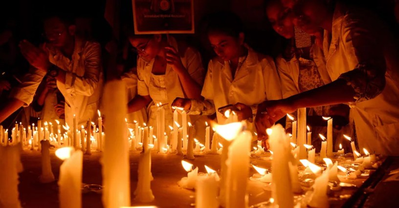 കൊൽക്കത്തയിൽ വനിതാ ഡോക്ടറെ ബലാത്സംഗം ചെയ്ത് കൊലപ്പെടുത്തിയ സംഭവത്തിൽ അപലപിച്ച് രാജ്യവ്യാപകമായി ഡോക്ടർമാരുടെ പണിമുടക്കിൽ മെഡിക്കൽ പ്രഫഷണലുകൾ മെഴുകുതിരി കത്തിച്ചപ്പോൾ. അഹമ്മദാബാദിൽനിന്നുള്ള ദൃശ്യം. (Photo by Sam PANTHAKY / AFP)