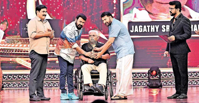 അമ്മ – മഴവിൽ മനോരമ എന്റർടെയ്ൻമെന്റ് അവാർഡ്സിലെ അൾട്ടിമേറ്റ് എന്റർടെയ്നർ പുരസ്കാരം നടൻ ജഗതി ശ്രീകുമാറിനു മമ്മൂട്ടിയും മോഹൻലാലും ചേർന്നു സമ്മാനിക്കുന്നു. മലബാർ ഗോൾഡ് ആൻഡ് ഡയമണ്ട്സ് ഹെഡ് ഓഫ് ഓപ്പറേഷൻസ് അബ്ദുൽ ജലീൽ, നടൻ രമേഷ് പിഷാരടി, മലയാള മനോരമ എക്സിക്യൂട്ടീവ് എഡിറ്റർ ജയന്ത് മാമ്മൻ മാത്യു എന്നിവർ സമീപം. ‘അമ്മ’യും കേരള ഫിലിം പ്രൊഡ്യൂസേഴ്സ് അസോസിയേഷനും മഴവിൽ മനോരമയും ചേർന്നാണ് അങ്കമാലിയിൽ പരിപാടി സംഘടിപ്പിച്ചത്.