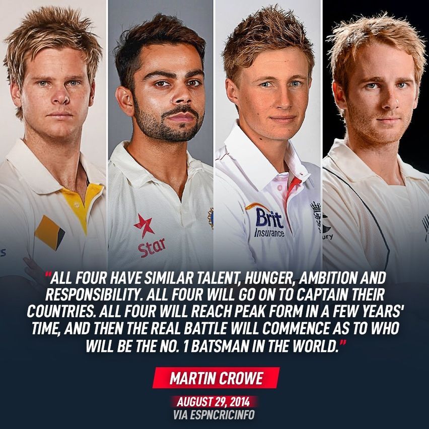 വിരാട് കോലി, സ്റ്റീവ് സ്മിത്ത്, ജോ റൂട്ട്, കെയ്ന് വില്യംസണ്, കഴിഞ്ഞ പതിറ്റാണ്ടിലെ ഏറ്റവും പ്രതിഭാധനരായ ബാറ്റര്മാരുടെ നിര. ഈ നാല് അസാമാന്യ ക്രിക്കറ്റ് താരങ്ങളുടെ ഉദയം അടയാളപ്പെടുത്തിയ വര്ഷമായിരുന്നു 2014. ലോക ക്രിക്കറ്റിലെ വിവിധ ഫോര്മാറ്റുകളില്, വിവിധ വേദികളിലായി ഈ നാലുപേര് തങ്ങളുടെ ടീമുകള്ക്കായി കാഴ്ചവെച്ച പ്രകടനങ്ങള് പകരംവെയ്ക്കാനാകാത്തതായിരുന്നു. സ്ഥിരത, സമ്മര്ദ ഘട്ടങ്ങളിലും മികച്ച പ്രകടനം നടത്താനുള്ള മികവ് എന്നിവയെല്ലാം കൊണ്ട് ഈ നാലുപേരും ക്രിക്കറ്റ് ലോകത്തെ ഏറ്റവും മികച്ച ബാറ്റര്മാരുടെ പട്ടികയിലേക്ക് ഉയരുകയും ചെയ്തു. പില്ക്കാലത്ത് ഈ നാലുപേരടങ്ങിയ സംഘത്തെ ക്രിക്കറ്റ് ലോകം വിശേഷിപ്പിച്ചത് ഫാബ് ഫോര് () എന്നായിരുന്നു. അന്തരിച്ച മുന് ന്യൂസീലന്ഡ് ക്രിക്കറ്റ് ഇതിഹാസം മാര്ട്ടിന് ക്രോയാണ് 2014-ല് അന്ന് ഈ നാല് യുവ ബാറ്റര്മാരുടെയും അസാധാരണമായ കഴിവുകള് തിരിച്ചറിഞ്ഞ് ഇവരെ ആദ്യമായി ഫാബ് ഫോര് എന്ന് വിശേഷിപ്പിച്ചത്.
