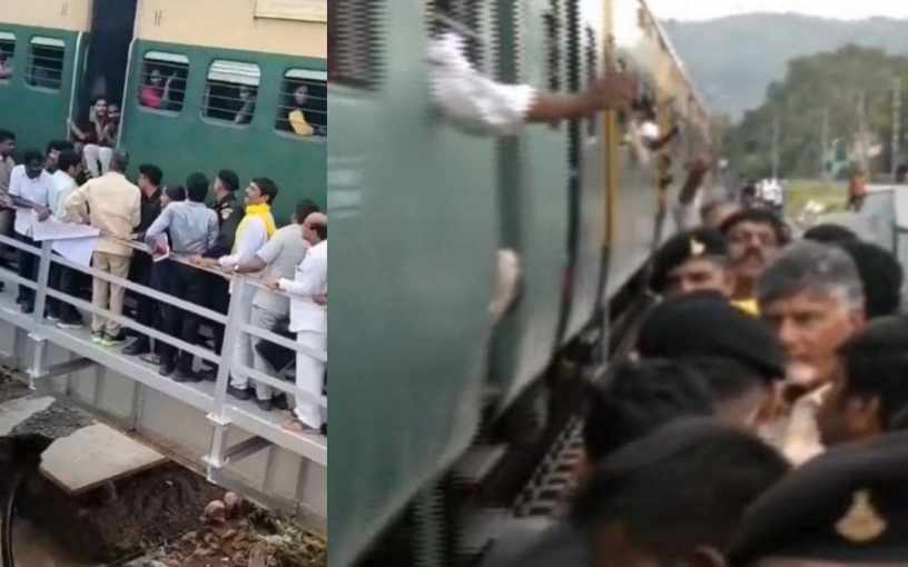 ട്രെയിൻ കടന്നുപോകുമ്പോൾ ഒരു വശത്തേക്ക് ഒതുങ്ങി നിൽക്കുന്ന ചന്ദ്രബാബു നായിഡു | Photo: PTI