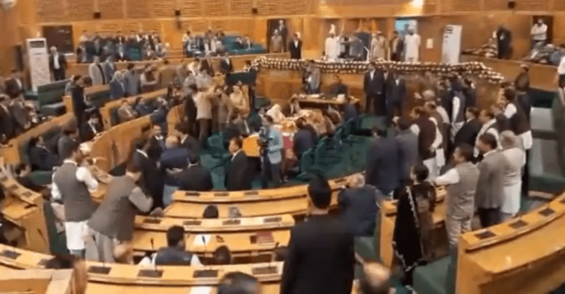ജമ്മു കശ്മീർ നിയമസഭാ സമ്മേളനത്തിന്റെ ആദ്യ ദിവസം തന്നെ സഭയിൽ ഉണ്ടായ ബഹളം (Photo:gulisthannews/X)