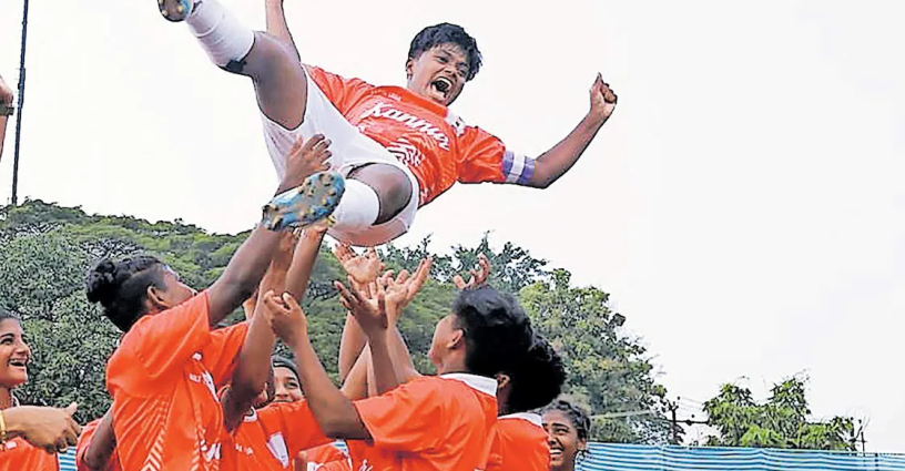സീനിയർ വിഭാഗം പെൺകുട്ടികളുടെ ഫുട്ബോൾ മത്സരത്തിൽ വിജയികളായ കണ്ണൂർ ടീം, ക്യാപ്റ്റൻ ഷിൽജി ഷാജിയെ എടുത്തുയർത്തി ആഹ്ലാദം പങ്കിടുന്നു