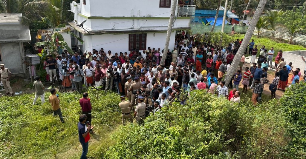 അമ്പലപ്പുഴ കരൂരിൽ ജയചന്ദ്രന്റെ വീടിന് സമീപം ആളുകൾ തടിച്ചുകൂടി നിൽക്കുന്നു