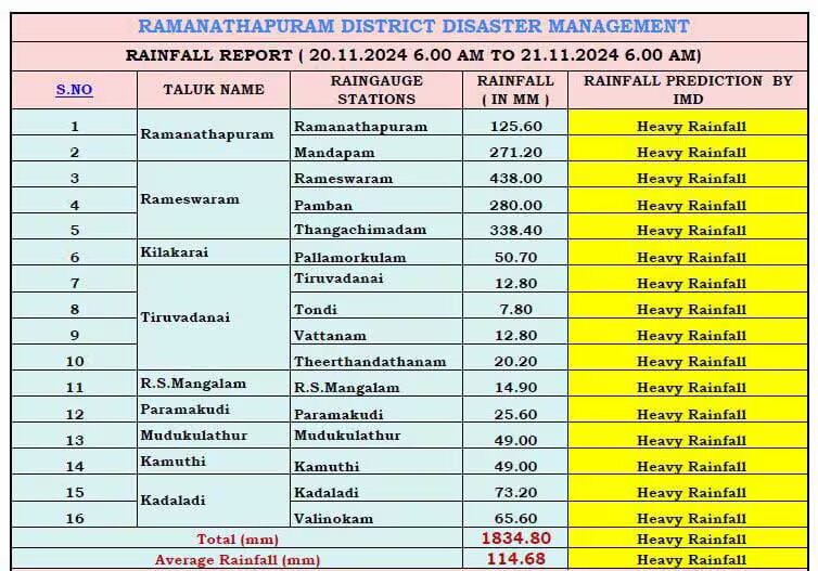 വടക്കുകിഴക്കൻ മൺസൂൺ ശക്തിപ്രാപിച്ചതിനു പിന്നാലെ രാമേശ്വരത്ത് മേഘവിസ്ഫോടനം. മൂന്ന് മണിക്കൂറിൽ 362 മില്ലിമീറ്റർ മഴയാണ് പെയ്തത്. പത്ത് മണിക്കൂറിൽ 411 മില്ലിമീറ്ററും രേഖപ്പെടുത്തിയിട്ടുണ്ട്. സമീപപ്രദേശമായ തങ്കച്ചിമാടത്ത് 322 മി.മീ, മണ്ഡപം– 261.40, പാമ്പൻ–237 മി.മീ മഴയും രേഖപ്പെടുത്തിയിട്ടുണ്ട്. ഇതുകൂടാതെ രാമനാഥപുരം ജില്ലയിലെ മുതുകുളത്തൂർ, കാമുടി, പരമകുടി എന്നിവിടങ്ങളിലും ശക്തമായ മഴ പെയ്തു. തമിഴ്നാട്ടിലെ തെക്കൻ ജില്ലകളിൽ വ്യാപക മഴയാണ് റിപ്പോർട്ട് ചെയ്യുന്നത്.