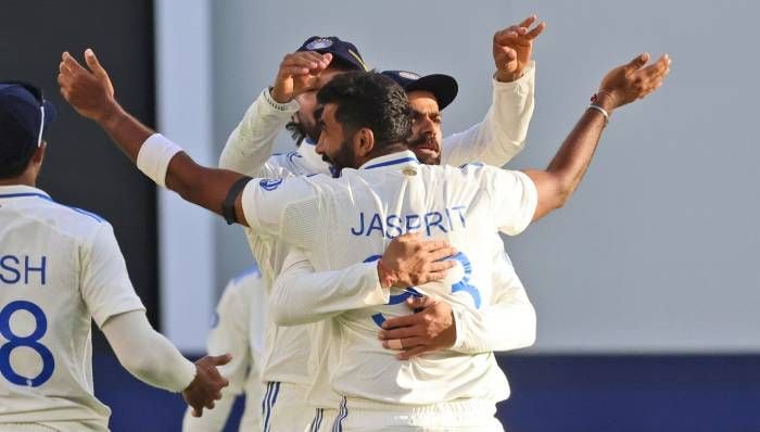ഓസ്ട്രേലിയൻ നായകൻ പാറ്റ് കമ്മിൻസിന്റെ വിക്കറ്റ് വീഴ്ത്തിയ ഇന്ത്യൻ ക്യാപ്റ്റൻ ജസ്പ്രീത് ബുംറയെ കെട്ടിപ്പിടിക്കുന്ന വിരാട് കോലി | Photo: AP