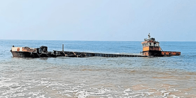 തുമ്പ തീരത്തെ മണലിൽ ഉറച്ച ബാർജിനെ ഉയർത്തി കൊണ്ടു പോകാൻ സാധിക്കുന്നില്ല; മണ്ണുമാറ്റി കരയിലേക്ക് വലിച്ചുകയറ്റാനുള്ള ശ്രമവും പരാജയം