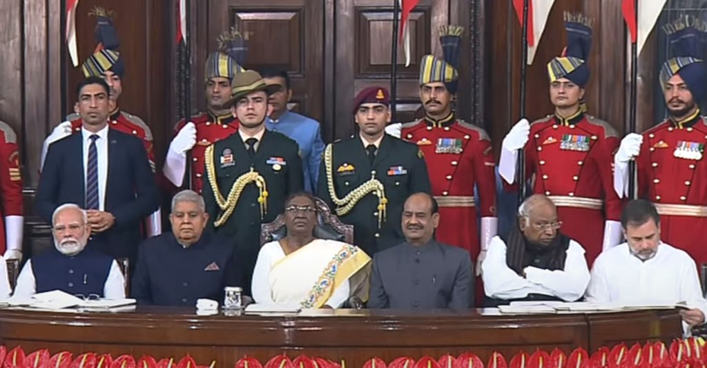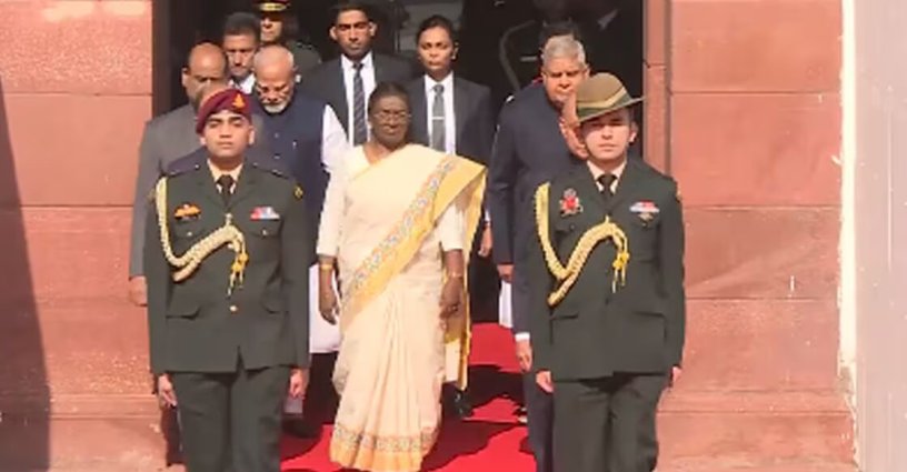 ഭരണഘടന അംഗീകരിക്കപ്പെട്ടതിന്റെ 75–ാം വാർഷിക ആഘോഷങ്ങൾക്കായി പഴയ പാർലമെന്റ് മന്ദിരത്തിലെ കോൺസ്റ്റിറ്റ്യൂവന്റ് ഹാളിലേക്കെത്തുന്ന രാഷ്ട്രപതി ദ്രൗപദി മുർമു. Image Credit: X/SansadTV