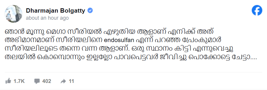 ഞാൻ മൂന്നു മെഗാ സീരിയൽ എഴുതിയ ആളാണ്. എനിക്ക് അത് അഭിമാനമാണ്. സീരിയലിനെ എൻഡോസൾഫാൻ എന്ന് പറഞ്ഞ പ്രേംകുമാർ സീരിയലിലൂടെ തന്നെ വന്ന ആളാണ്. ഒരു സ്ഥാനം കിട്ടി എന്നുവെച്ചു തലയിൽ കൊമ്പൊന്നും ഇല്ലല്ലോ പാവപെട്ടവർ ജീവിച്ചു പൊക്കോട്ടെ ചേട്ടാ, ധർമജൻ ഫെയ്സ്ബുക്കിൽ കുറിച്ചു.