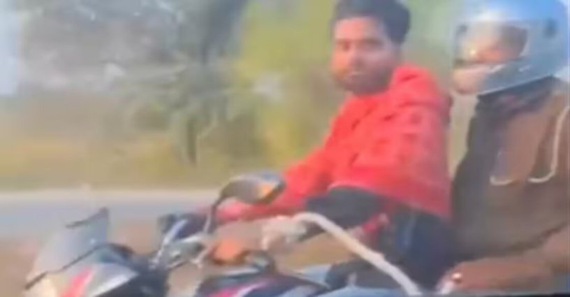 കയ്യിൽ കയറുമായി പൊലീസ് ഉദ്യോഗസ്ഥനെ പുറകിലിരുത്തി പ്രതിയുടെ യാത്ര (Photo:@bstvlive/X)