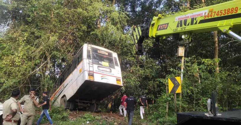 രാവിലെ എട്ടുമണിയോടെയാണ് സംഭവം. ശബരിമല ദർശനം നടത്തി മടങ്ങുകയായിരുന്ന 15 തീർഥാടകർ ബസിൽ ഉണ്ടായിരുന്നു. സൂപ്പർഫാസ്റ്റ് ഡീലക്സ് ബസാണ് അപകടത്തിൽപ്പെട്ടത്. ബസിന്റെ ബ്രേക്ക് നഷ്ടപ്പെട്ടതായി ഡ്രൈവർ യാത്രക്കാർക്ക് മുന്നറിയിപ്പു നൽകി. വാഹനം നിർത്താൻ ശ്രമിച്ചെങ്കിലും സാധിച്ചില്ല. ബസ് മരത്തിൽ തങ്ങി നിന്നതോടെ യാത്രക്കാർ ഉടൻ പുറത്തിറങ്ങി. രണ്ടു ക്രെയിൻ ഉപയോഗിച്ച് ബസ് പിന്നീട് പുറത്തെടുത്തു.
