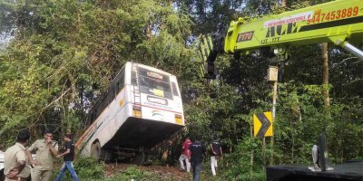 പമ്പാവാലിക്ക് സമീപം നാറണന്തോട് ഭാഗത്ത് ശബരിമല തീർഥാടകരുമായി പോയ കെഎസ്ആർടിസി ബസ് ബ്രേക്ക് നഷ്ടപ്പെട്ട് കുഴിയിലേക്ക് ചെരിഞ്ഞു