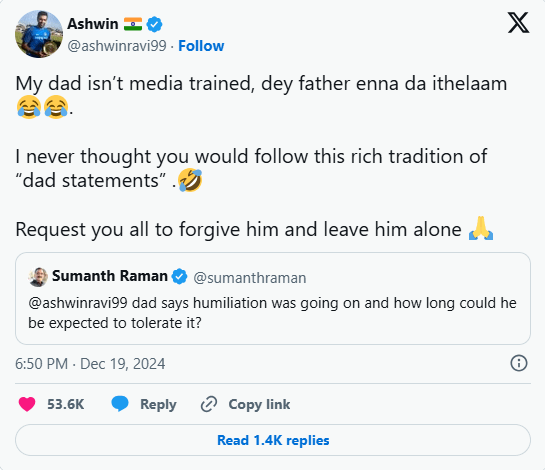 ചെന്നൈ ∙ പിതാവ് രവിചന്ദ്രന് മാധ്യമങ്ങളെ കൈകാര്യം ചെയ്യാനുള്ള പരിശീലനം ലഭിച്ചിട്ടില്ലെന്ന് മുൻ ഇന്ത്യൻ താരം ആർ. അശ്വിൻ. അശ്വിൻ അപമാനിക്കപ്പെട്ടതായി പിതാവ് രവിചന്ദ്രൻ കഴിഞ്ഞ ദിവസം തുറന്നടിച്ചിരുന്നു. അതിനു പിന്നാലെയാണ് എക്സ് പ്ലാറ്റ്ഫോമിൽ അശ്വിൻ നിലപാടു വ്യക്തമാക്കിയത്. ‘‘എന്റെ പിതാവ് മാധ്യമ പരിശീലനം നേടിയിട്ടില്ലാത്ത ആളാണ്. ഏയ് അച്ഛാ, എന്താണ് ഇതെല്ലാം. അദ്ദേഹത്തിന് മാപ്പു നൽകി വെറുതെ വിടണമെന്ന് എല്ലാവരോടും അഭ്യർഥിക്കുന്നു.’’ – അശ്വിൻ എക്സ് പ്ലാറ്റ്ഫോമിൽ കുറിച്ചു.