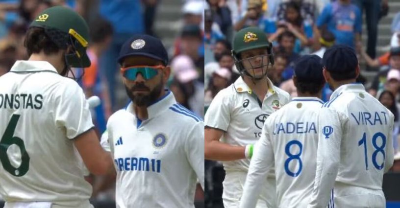 സാം കോൺസ്റ്റാസും വിരാട് കോലിയും ഗ്രൗണ്ടിൽവച്ച് തർക്കിക്കുന്നു. Photo: X@Screengrab, 7 sports