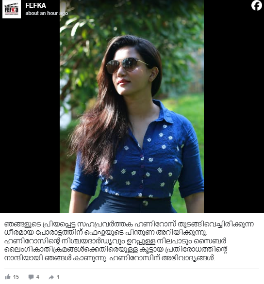 ഞങ്ങളുടെ പ്രിയപ്പെട്ട സഹപ്രവർത്തക ഹണിറോസ് തുടങ്ങിവെച്ചിരിക്കുന്ന ധീരമായ പോരാട്ടത്തിന് ഫെഫ്കയുടെ പിന്തുണ അറിയിക്കുന്നു. ഹണിറോസിൻ്റെ നിശ്ചയദാർഡ്യവും ഉറപ്പുള്ള നിലപാടും സൈബർ ലൈംഗികാതിക്രമങ്ങൾക്കെതിരെയുള്ള കൂട്ടായ പ്രതിരോധത്തിൻ്റെ നാന്ദിയായി ഞങ്ങൾ കാണുന്നു. ഹണിറോസിന് അഭിവാദ്യങ്ങൾ. – ഫേസ്ബുക്കിൽ കുറിച്ചു.
