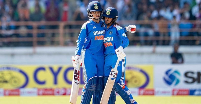ഓപ്പണിങ് വിക്കറ്റിൽ 156 റൺസിന്റെ തകർപ്പൻ കൂട്ടുകെട്ടുമായി സ്മൃതി മന്ഥന – പ്രതിക റാവൽ സഖ്യം ഇന്ത്യയ്ക്ക് തകർപ്പൻ തുടക്കമാണ് സമ്മാനിച്ചത്. വെറും 114 പന്തിലാണ് ഇരുവരും 156 റൺസ് അടിച്ചുകൂട്ടിയത്. അതേ സ്കോറിൽ ഇരുവരും തുടർച്ചയായി പുറത്തായെങ്കിലും, മൂന്നാം വിക്കറ്റിൽ വീണ്ടും സെഞ്ചറി കൂട്ടുകെട്ടുമായി ഹർലീൻ ഡിയോൾ – ജമീമ റോഡ്രിഗസ് സഖ്യം ഇന്ത്യയെ കൂറ്റൻ സ്കോറിലേക്ക് നയിച്ചു. 168 പന്തിൽ ഇരുവരും ഇന്ത്യൻ സ്കോർ ബോർഡിൽ എത്തിച്ചത് 183 റൺസ്.