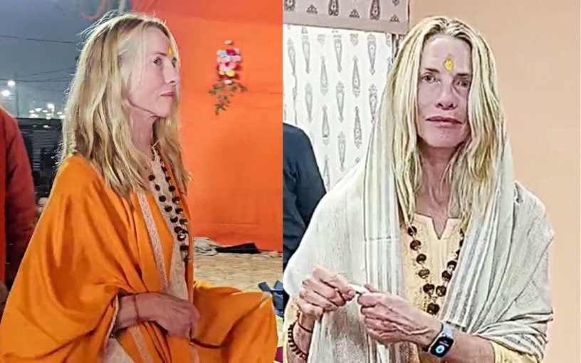 ലോറീൻ പവൽ ജോബ്സ് പ്രയാഗ്രാജിലെ ആശ്രമത്തിൽ | ഫോട്ടോ: ANI