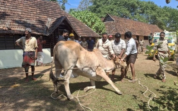 കാളയെ ഫയര്ഫോഴ്സിന്റെയും ആനപാപ്പാന്റെയും സഹായത്തോടെ കുരുക്കിട്ട് പിടികൂടുന്നു