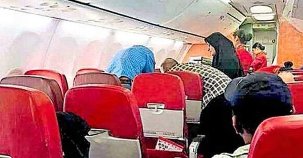 വിമാനത്തിൽ തീർഥാടകയ്ക്കു ചികിത്സ നൽകുന്നതിന്റെ ദൃശ്യം.