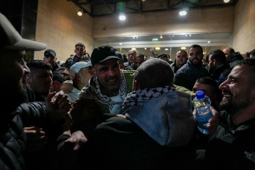 2025 ഫെബ്രുവരി 27 ന് വെസ്റ്റ് ബാങ്ക് നഗരമായ റാമല്ലയിലെ ഇസ്രായേലി ജയിലിൽ നിന്ന് മോചിതരായ പലസ്തീനികളെ സ്വാഗതം ചെയ്യുന്നു.