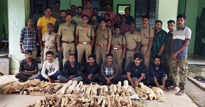 തമിഴ്നാട് തിരുവണ്ണമല സ്വദേശികളായ മുരളി, കുപ്പുസ്വാമി, സെന്തിൽ, കുമാർ, തങ്കരാജ്, പാലക്കാട് വാഴമ്പുറം സ്വദേശി ഗഫൂർ അലി, വല്ലപ്പുഴ സ്വദേശി ഹുസൈൻ എന്നിവരാണ് പിടിയിലായത്. ഷോളയൂർ മരപ്പാലത്ത് നിന്നും ചന്ദന കഷ്ണങ്ങൾ കാറിൽ കയറ്റുന്നതിനിടെയാണ് വനം വകുപ്പ് പ്രതികളെ പിടികൂടിയത്.