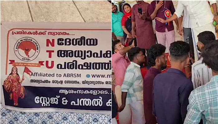 ബാനർ നീക്കം ചെയ്യണമെന്ന് ആവശ്യപ്പെട്ടുകൊണ്ടായിരുന്നു എസ്എഫ്ഐ, ഡിവൈഎഫ്ഐ പ്രവര്ത്തകരെത്തിയത്. ഇതോടെ ഇരുവിഭാഗവും തമ്മിൽ വാക്കുതർക്കമുണ്ടായി. ബാനർ നീക്കം ചെയ്യുന്നതിനെതിരെ അധ്യാപക പരിഷത്ത് പ്രവര്ത്തകരും രംഗത്തെത്തി. തർക്കം രൂക്ഷമായതോടെ ഡിഡിഇ നടത്തിയ ചർച്ചയ്ക്ക് ഒടുവിൽ ഭാരതാംബയുടെ ചിത്രം കർട്ടൺ ഉപയോഗിച്ച് മറച്ച് തർത്തിന് പരിഹാരം കാണുകയായിരുന്നു.