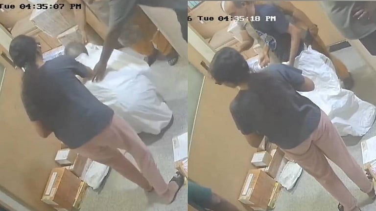 ചൊവ്വാഴ്ച വൈലിക്കാവൽ പൊലീസ് സ്റ്റേഷൻ പരിധിയിലുള്ള ഒരു കൊറിയർ സർവീസ് ഓഫീസിലായിരുന്നു സംഭവം. ഒരു വലിയ പൊതിയുമായി ഒരു സ്ത്രീ, ഭർത്താവ്, ഭാര്യാമാതാവ്, സഹോദരൻ എന്നിവർ അടങ്ങുന്ന കുടുംബത്തിലെ അഞ്ച് പേർ കൊറിയർ ഓഫീസിലെത്തുകയായിരുന്നു. അകത്ത് എന്താണെന്ന് ജീവനക്കാർ ചോദിച്ചപ്പോൾ കുടുംബം മൗനം പാലിച്ചതിനെ തുടർന്ന് ജീവനക്കാർ പൊതി തുറന്നപ്പോളാണ് ചാക്കിനുള്ളിൽ യുവതിയുടെ പിതാവിനെ കണ്ടത്. സംഭവത്തിൻ്റെ പുറത്തു വന്ന ദൃശ്യങ്ങളിൽ ചാക്കിൽ നിന്ന് പുറത്തു വന്ന മനുഷ്യൻ അസ്വസ്ഥനായും, ശ്വസിക്കാൻ ബുദ്ധിമുട്ടുന്നതായും കാണാം.